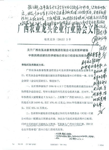 近日,廣西農(nóng)業(yè)龍頭企業(yè)行業(yè)協(xié)會向自治區(qū)政府張副主席呈送了《關于廣西農(nóng)墾永新畜牧集團有限公司良圻原種豬場申請供港活豬注冊養(yǎng)殖場自營出口經(jīng)營權的報告》,該報告受到了副主席的高度重視。8月12日,自治區(qū)政府張曉欽副主席等分別對該報告作出了重要批示。