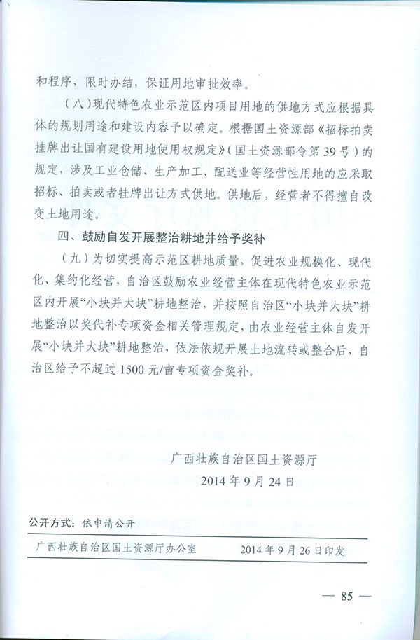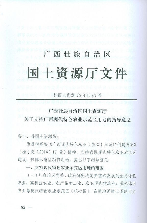 以下是自治區(qū)國土資源廳 《關(guān)于支持廣西現(xiàn)代特色農(nóng)業(yè)示范區(qū)用地的指導(dǎo)意見》原文掃描件: