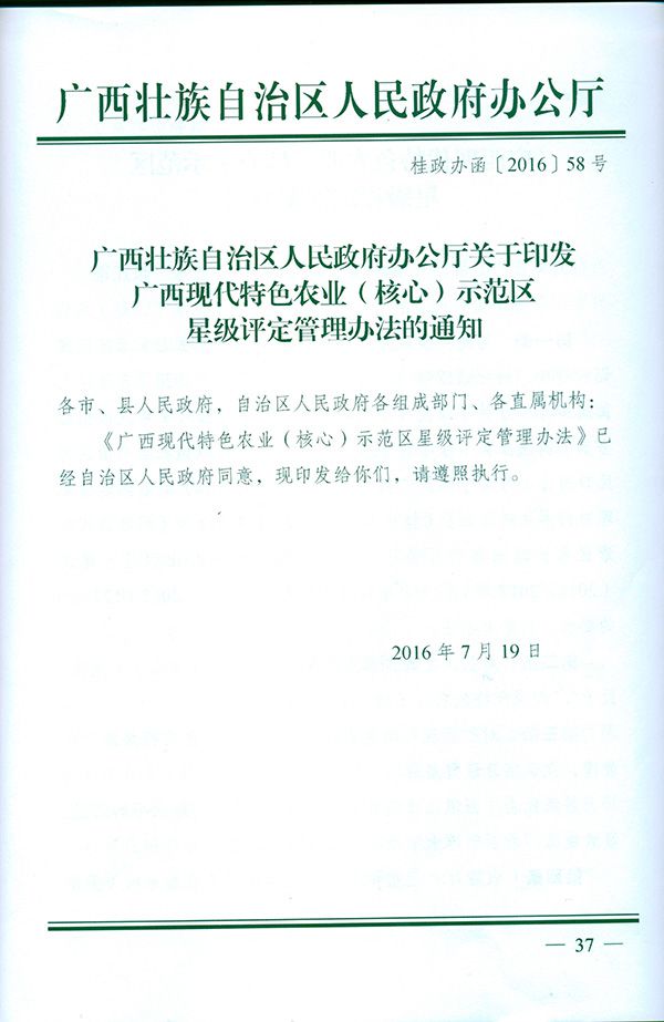 以下是廣西壯族自治區(qū)政府辦公廳關(guān)于印發(fā)《廣西現(xiàn)代特色農(nóng)業(yè)(核心)示范區(qū)星級評定管理辦法》的通知【桂政辦函[2016]58號】原文掃描件: