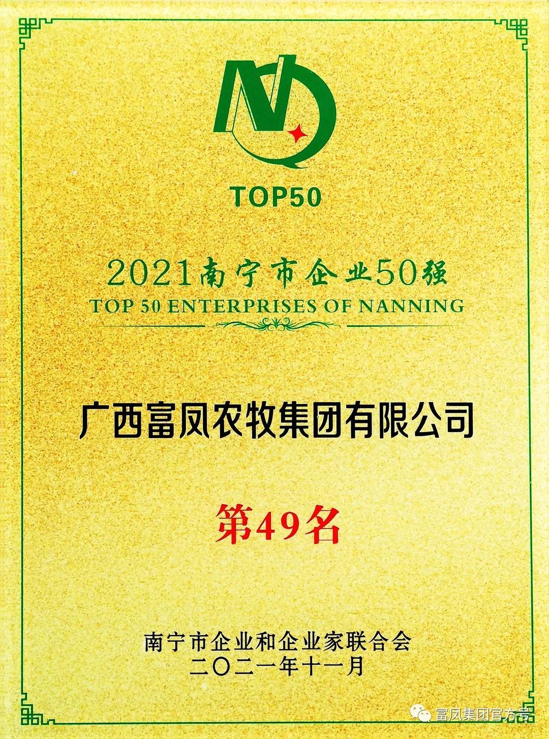 2021 年 11 月 17 日,南寧市企業(yè)和企業(yè)家聯(lián)合會以“凝心聚力全面貫徹落實強首府戰(zhàn)略,擔當作為推動南寧企業(yè)高質量發(fā)展”為主題,在南寧明園飯店隆重舉辦2021年南寧市企業(yè)家活動日。會上,廣西農業(yè)龍頭企業(yè)行業(yè)協(xié)會副會長單位廣西富鳳農牧集團榮獲2021年南寧市企業(yè)50強(第49名)和南寧市制造業(yè)企業(yè)30強(第18名),集團韋宗海常務副總代表企業(yè)接受大會表彰,我們?yōu)楦圾P集團新的發(fā)展成就和獲得的新榮譽表示熱烈祝賀!