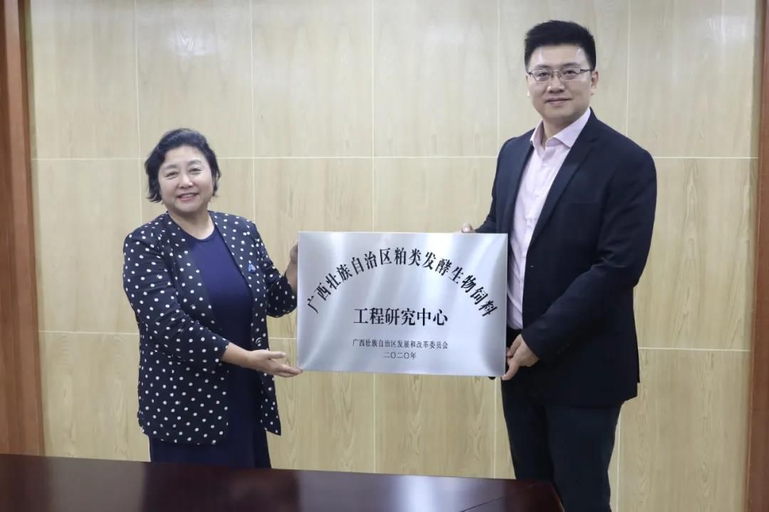 同一時間,在發(fā)改委辦公室,張慧總經(jīng)理滿懷欣喜地從市發(fā)改委榮毅宏主任手中接過由自治區(qū)發(fā)改委頒發(fā)的“廣西自治區(qū)粕類發(fā)酵生物飼料工程研究中心”牌匾,意味著澳加糧油粕類發(fā)酵生物飼料工程研究邁上新臺階!