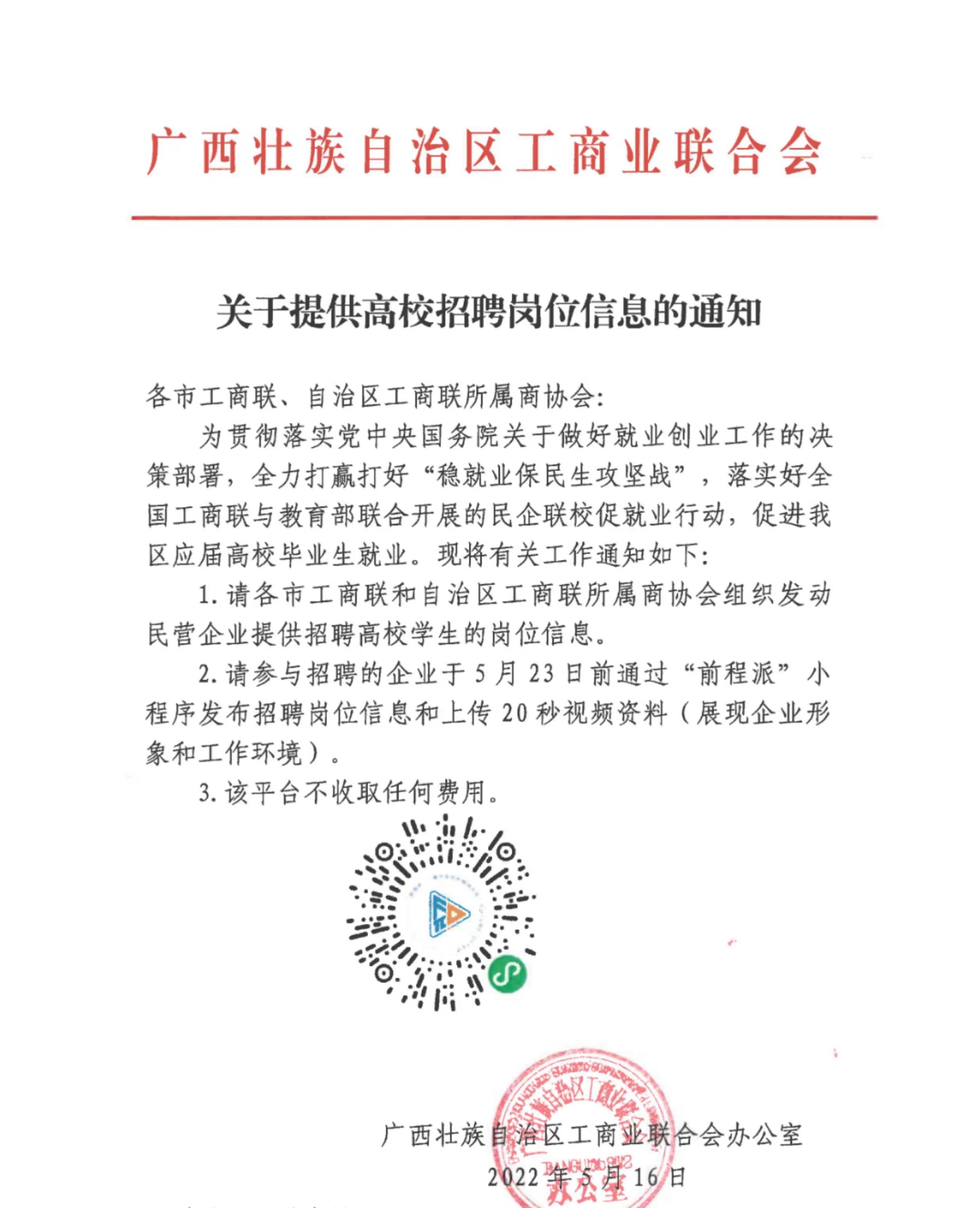 為貫徹落實(shí)黨中央國務(wù)院關(guān)于做好就業(yè)創(chuàng)業(yè)工作的決策部署,全力打贏打好“穩(wěn)就業(yè)保民生攻堅(jiān)戰(zhàn)”,落實(shí)好全國工商聯(lián)與教育部聯(lián)合開展的民企聯(lián)校促就業(yè)行動(dòng),促進(jìn)我區(qū)應(yīng)屆高校畢業(yè)生就業(yè),我們倡議我會(huì)各會(huì)員單位及有關(guān)企業(yè)結(jié)合自身實(shí)際積極行動(dòng)起來,主動(dòng)提供招聘應(yīng)屆高校畢業(yè)生的崗位信息,于5月23日前通過“前程派”小程序發(fā)布招聘崗位信息和上傳20秒視頻資料(展現(xiàn)企業(yè)形象和工作環(huán)境)。該平臺(tái)不收取任何費(fèi)用,請(qǐng)各企業(yè)按照實(shí)際情況貫徹執(zhí)行,積極提供發(fā)布招聘應(yīng)屆高校畢業(yè)生的崗位信息,助力我區(qū)應(yīng)屆畢業(yè)生高質(zhì)量就業(yè)。