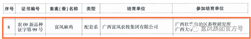 廣西農(nóng)業(yè)龍頭企業(yè)行業(yè)協(xié)會副會長單位——廣西富鳳集團(tuán)致力于地方優(yōu)質(zhì)雞種質(zhì)資源的開發(fā)和利用,運用先進(jìn)的育種技術(shù),創(chuàng)新引領(lǐng),專心專注富鳳麻雞配套系新品種培育,近日,國家農(nóng)業(yè)農(nóng)村部發(fā)布第635號公告,全國新增15個畜禽新品種配套系,廣西富鳳麻雞配套系,經(jīng)國家畜禽遺傳資源委員會審定通過,并獲得畜禽配套系證書,這是富鳳集團(tuán)事業(yè)發(fā)展史上具有里程碑意義的重大喜慶,在此我們致以熱烈祝賀!