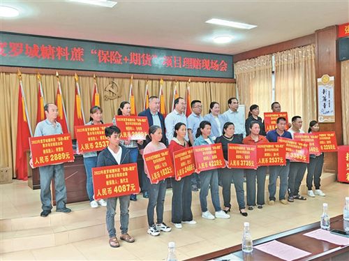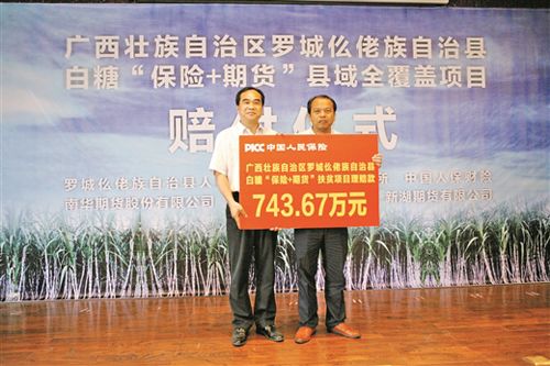 中國(guó)人保全國(guó)首個(gè)白糖“保險(xiǎn)+期貨”項(xiàng)目在廣西羅城舉行賠付儀式。